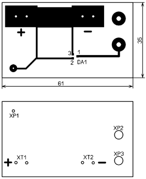 Чертёж печатной платы амперметра показан на рис. 6. Для неё использован фольгированный стеклотекстолит с толщиной медного слоя предположительно 35 мкм. Функция датчика тока (резистора R1) в этом случае выполняет печатный проводник (можно применить отрезок медного обмоточного провода). Резистор R2 (типоразмер 1206) устанавливать необязательно, он, как сказано выше, ограничивает ток через микроамперметр в случае возникновения аварийной ситуации. Взамен этого резистора на плате можно установить проволочную перемычку. Чтобы уменьшить падение напряжения на соединительных контактах, применены два параллельно соединённых клеммника XT 1 и XT2, к которым подключают по два соединительных провода.