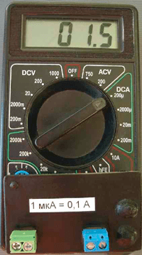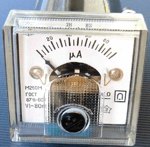 Следует напомнить, что при отсутствии тока нагрузки микросхема потребляет ток, а это будет приводить к отклонению стрелки. Но эту ситуацию исправить просто, достаточно при подключённом к источнику питания устройстве с помощью корректора установить стрелку микроамперметра на нулевую отметку шкалы.
