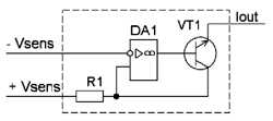 Существенно уменьшить падение напряжения на датчике тока можно, применив специализированную микросхему, предназначенную для совместной работы с ним. Таких микросхем не так уж и мало, но мы рассмотрим одну из них - ZXCT1009F. Упрощённая схема её "начинки" показана на рис. 3, а схема включения и цоколёвка - на рис. 4. Эта микросхема представляет собой преобразователь напряжение/ток, т. е. она преобразует падение напряжения UR1 между входами в выходной ток Iвых. Коэффициент преобразования K = 10мА/В, это означает, что при UR1 = 1 В выходной ток Iвых = 10 мА. Микросхема предназначена для работы в цепях с напряжением 2,5...20 В, максимальный выходной ток - 25 мА, собственный потребляемый ток (при UR1 = 0 В) - не более 4 мкА. Совместно с датчиком тока эта микросхема будет работать, по сути, как "зеркало" тока.