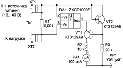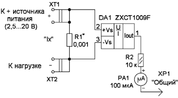 Следует отметить, что совместно с микросхемой ZXCT1009F можно применить практически любой микроамперметр, главное, чтобы микросхема работала в допустимом интервале питающего напряжения.