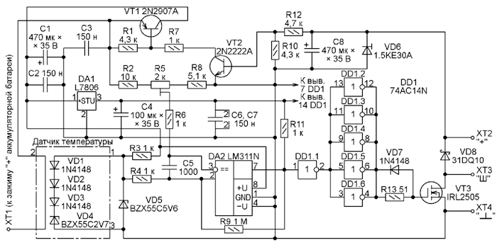 Стабилитрон VD5, подключённый параллельно датчику температуры, необходим для ограничения максимального напряжения на батарее. Без него при морозах ниже -20 оС напряжение в бортсети может возрасти настолько, что подключённые к ней потребители электроэнергии будут испорчены.