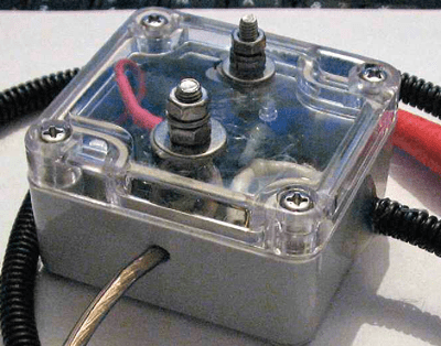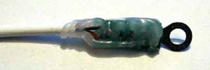 Затем на жгут из трёх подключённых к плате датчика температуры проводов одета гофрированная пластиковая трубка диаметром 6,8 мм. Со стороны реле-регулятора гофр зафиксирован термопластичным клеем, а со стороны датчика - термоусаживаемой трубкой. Во время эксплуатации реле-регулятора в автомобиле эта трубка предотвращает повреждение проводов, соединяющих реле-регулятор с датчиком. При надёжной фиксации проводов, исключающей их перетирание, многократные перегибы и прочие механические воздействия, от гофрированной трубки можно отказаться.