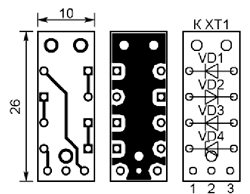 Все детали реле-регулятора, кроме образующих датчик температуры диодов VD1-VD3 и стабилитрона VD4, размещены на печатной плате, чертёж которой изображён на рис. 2. Она рассчитана на установку постоянных резисторов С2-23 или С1-4, подстроечного резистора R5 - многооборотного 3266W. Оксидные конденсаторы - К50-35 или импортные. Остальные конденсаторы - керамические К10-17б или их импортные аналоги. XT1 - контактный лепесток, присоединяемый к плюсовому выводу аккумуляторной батареи; XT2 - шпилька М5, к которой подключают красный провод, шедший к штатному реле-регулятору; XT3 - шпилька М4. К ней подключают чёрный провод, идущий к обмотке возбуждения генератора. XT4 соединяют с корпусом автомобиля. После монтажа деталей плату нужно покрыть влагозащитным лаком. Готовая плата помещена в герметичный пластмассовый корпус G201C (рис. 3).