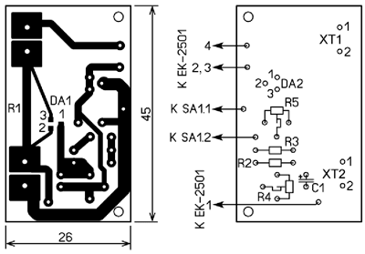 Интервал выходного напряжения выпрямителя, при котором работает устройство, - 9...20 В. Если удалить стабилизатор на микросхеме DA2, этот интервал увеличится до 6,5...20 В. Установка датчика тока между выходом выпрямителя и входом стабилизатора напряжения обусловлена тем, что нижний предел интервала регулирования выходного напряжения - 0...1 В. Если нижний предел - 5,5 В (но не более 20 В), датчик включают в выходную плюсовую линию, тогда элементы компенсации также не нужны. В этом случае элементы R2, R3, R5, DA2 не устанавливают, вместо резистора R2 и микросхемы DA2 на плате устанавливают перемычки. Переключатель SA1.1 станет ненужным, и его можно использовать на месте SA1.3.