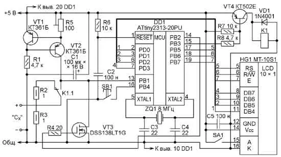 На транзисторах VT1 и VT2 реализован источник тока зарядки конденсатора, изменяют этот ток подстроечным резистором R5. Пороговым устройством служит встроенный в микроконтроллер аналоговый компаратор, работающий с образцовым напряжением 1,11 В. Полевой транзистор VT3, закрывшись по команде микроконтроллера, разрешает зарядку измеряемого конденсатора от источника тока. Тактовая частота микроконтроллера и, следовательно, частота вырабатываемых им счётных импульсов стабилизирована кварцевым резонатором ZQ1. Результат измерения микроконтроллер выводит наЖКИ HG1.