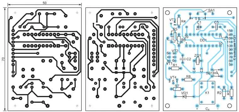 Чертёж печатной платы прибора изображён на рис. 2. Она рассчитана на установку выводных постоянных резисторов мощностью 0,25 Вт и подстроечного резистора 3266W1-1-101LF. Оксидный конденсатор C1 - К50-35, керамические конденсаторы C2, C5 - К10-17, C3 и C4 - типоразмера 1206 для поверхностного монтажа. Реле - HK4100F-5VDC-SHG с сопротивлением обмотки 125 Ом.