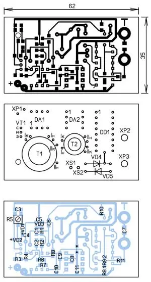 Чертёж печатной платы и расположение элементов показаны на рис. 2. Поверхностно монтируемые элементы - конденсаторы и резисторы типоразмера 1206, диоды Шоттки VD1, VD2 и защитный TVS-диод VD3 (супрессор) - монтируют со стороны печатных проводников. Диод VD3 устанавливают на конденсаторе C5. Остальные элементы - выводные для монтажа в отверстия, установлены на лицевой стороне платы.
