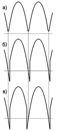 С гнёзд XS1, XS2 снимают перемычку, и вместо неё подключают резистор сопротивлением 20 Ом. Размах напряжения увеличится вдвое (сопротивление нагрузки 20 Ом в пересчёте на первичную обмотку возрастает в квадрат коэффициента трансформации). Вход осциллографа подключают к точке соединения резистора R8 с трансформатором T1. Размах напряжения не должен превышать 150...200 мВ. В противном случае следует подобрать ёмкость конденсатора С5, который корректирует фазу напряжения на среднем выводе трансформатора. Далее вход осциллографа подключают к выходу Y (выводу 3) мультиплексора DD1. На экране должны быть видны выпрямленные синусоиды положительной полярности амплитудой около 0,315 В без видимых искажений, как показано на рис. 3,а. В противном случае подбирают ёмкость конденсатора С6. На рис. 3,б показана форма выпрямленного сигнала, когда эта ёмкость больше требуемой. Детектирование синусоид отрицательной полярности свидетельствует о том, что выводы у одной из обмоток, подключённой к гнёздам "Cx", необходимо поменять местами. Рис. 3,в демонстрирует случай, когда пороговое напряжение цифрового входа 1 мультиплексора отлично от половины напряжения питания. В этом случае следует подобрать резистор R9. На печатной плате предусмотрены места для установки двух резисторов при его подборе - R9.1 и R9.2. Точной установки показаний мультиметра 200 мВ соответствующим ЭПС 20 Ом добиваются движком подстроечного резистора R5. На этом налаживание можно считать законченным. Измерение ЭПС производят на пределе 200 мВ мультиметра, при этом показания индикатора в милливольтах (результат измерения) следует разделить на десять.
