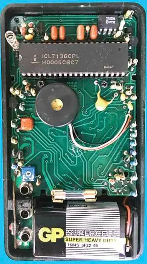 В имеющемся мультиметре в режиме звуковой прозвонки цепей изначально был применён сдвоенный ОУ LM358, но задействован только один из двух. Ток потребления ОУ - около 0,45 мА. Для существенного уменьшения общего тока потребления мультиметром этот ОУ был заменён отечественным КР140УД1208 согласно его штатной схеме включения [2]. Цоколёвка ОУ КР140УД1208 отлична от цоколёвки LM358, и это необходимо учитывать при замене. Резистор, задающий ток потребления ОУ [2], подключён между выводом 8 ОУ и выводом 37 АЦП (-5 В). Поскольку напряжение на выводе 37 стабилизировано, ток потребления ОУ остаётся неизменным при снижении напряжения батареи питания до 6...7 В. Подбором резистора ток потребления ОУ задан в пределах 20...25 мкА. При этом общий ток, потребляемый мультиметром, составил всего 120 мкА! Фото доработанного варианта с установленными микросхемами ICL7136CPL и КР140УД1208 показано на рис. 2.