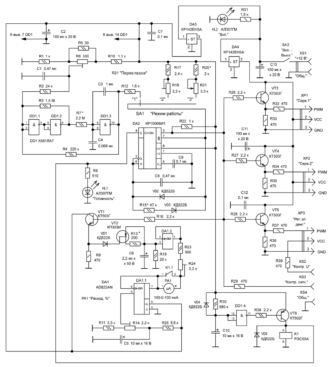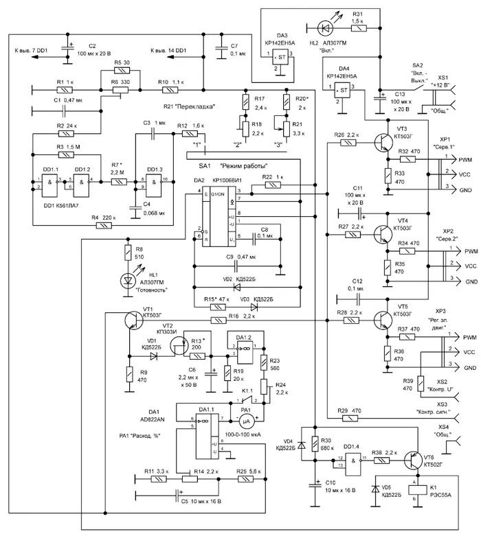 Индикатор расхода рулевых машинок и относительной частоты вращения электродвигателя - стрелочный микроамперметр PA1 ("Расход, %"). Для устранения опасных для него бросков тока, возникающих во время включения и выключения прибора, а также устранения возможности резкого отклонения качалки рулевых машинок за пределы рабочего интервала во время включения прибора, служит реле выдержки времени, которое включает в себя логический элемент DD1.4, транзистор VT6, диоды VD4, VD5, светодиод HL1 ("Готовность"), резисторы R8, R30, R38, конденсатор C10 и электромагнитное реле K1. Конденсатор C10 и резистор R30 - времязадающие элементы, логический элемент DD1.4 - пороговое устройство, транзистор VT6 - усилитель тока, повышающий нагрузочную способность логического элемента DD1.4. Диод VD5 защищает транзистор VT6 от возможного пробоя импульсами напряжения самоиндукции обмотки реле К1. Диод VD4 обеспечивает быструю разрядку конденсатора C10 после выключения прибора. Токоограничивающий резистор R8 и светодиод HL1 - узел индикации срабатывания реле выдержки времени.