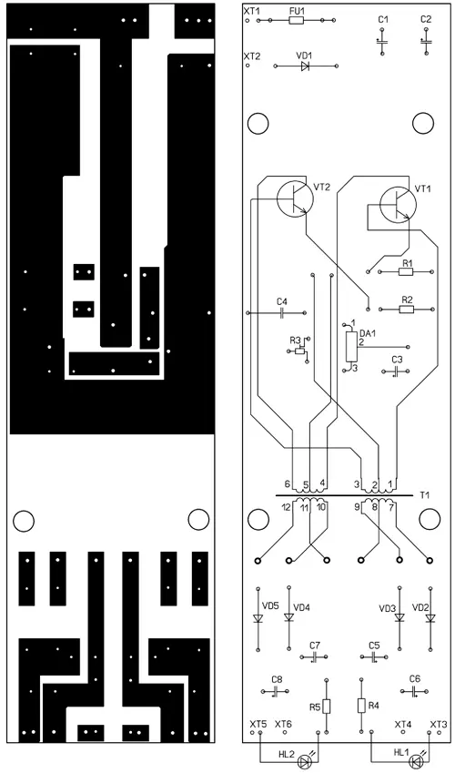 Рис. 5. Чертёж печатной платы БП и схема расположения на ней элементов