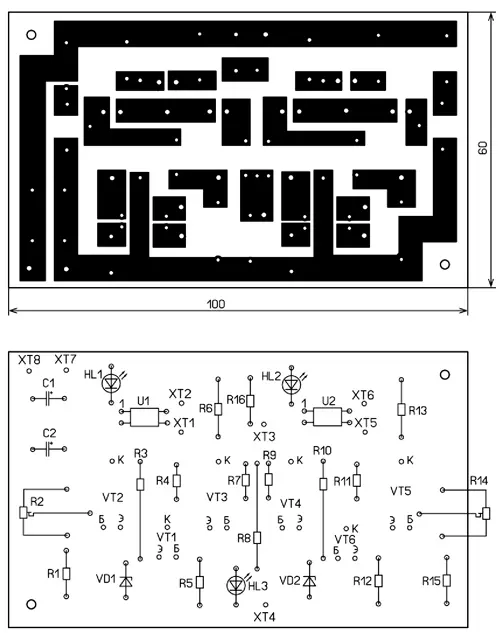 Чертёж печатной платы БП (размеры - 60x213 мм) и схема расположения на ней элементов показаны на рис. 5. Индикаторные светодиоды HL1 и HL2 вынесены на переднюю панель-дверцу ПКП. Транзисторы установлены через теплопроводящие изолирующие прокладки на алюминиевый теплоотвод размерами 60x55 мм от компьютерного блока питания.