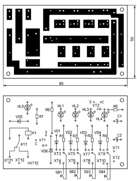 Чертёж печатной платы БЛ и схема расположения на ней элементов показаны на рис. 7. Светодиоды HL1 -HL5 и кнопки SB1-SB4 вынесены на переднюю панель-дверцу ПКП. Применены постоянные резисторы МЛТ, С2-23, подстроенные - СП3-3, оксидные конденсаторы - импортные. Диоды VD1 - VD5 - любые маломощные выпрямительные. Светодиоды HL1 -HL4 - маломощные красного свечения. Реле должно быть с номинальным напряжением обмотки 12 В и контактами, рассчи-танными на коммутацию тока, потребляемого сигнальными устройствами.