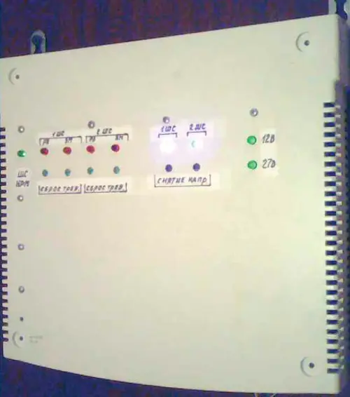 ПКП собран в подходящем по размерам пластмассовом корпусе, внутри которого закреплены печатные платы (рис. 8). Под каждую кнопку и светодиод сверлят отверстия диаметром 5 мм. Затем детали приклеивают. Применены кнопки из компьютерных мышей. Толкатели кнопок оказываются внутри цилиндрических отверстий, что исключает их случайное нажатие. На кнопки нажимают вязальной спицей диаметром 4 мм или концом спички. Внешний вид устройства показан на рис. 9. Питать его можно и от бесперебойного источникапитания.