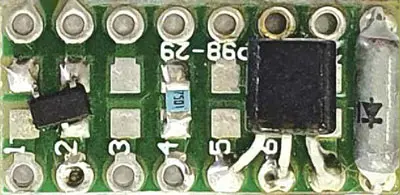 Детали, используемые для доработки, установлены на печатной плате размерами 10,5x20,5 мм, приобретённой в интернет-магазине. На плате на расстоянии 7,62 мм друг от друга выполнены два ряда по восемь металлизированных отверстий с шагом 2,54 мм и пары контактов для элементов, предназначенных для поверхностного монтажа. На рис. 2 приведён схематичный чертёж установки элементов и перемычек на плате (для резистора R8 отведены два посадочных места для возможного подбора сопротивления), а на рис. 3 - фотография с установленными элементами до распайки перемычек.