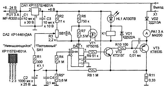 В режиме "Уменьшающийся" (контакты выключателя SA1 разомкнуты) конденсатор С2 емкостью 1000 мкФ разряжается через резистор R5 с постоянной времени, выбранной по формуле (3). Экспоненциально уменьшающийся ток через этот конденсатор усиливается ОУ DA2.1 и транзисторами VT2, VT3 и заряжает аккумуляторы, подключенные к разъему Х1 ("Выход"). Диод VD2 предотвращает их разрядку при отключении напряжения питания. Амперметр РА1 служит для контроля текущего значения тока зарядки. Конденсатор С5 предотвращает самовозбуждение устройства. Резисторы R4, R8-R10 - токоограничительные. Они защищают ОУ и транзистор VT2 в аварийных ситуациях, например, при обрыве резистора R11 или пробое транзистора VT3, предотвращая выход из строя остальных элементов.