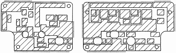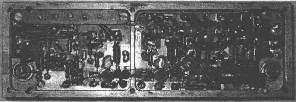 Печатная плата усилителя (рис.2) состоит из двух частей размерами 65x45 мм и 82x45 мм. Она изготавливается из двустороннего фольгированного стеклотекстолита толщиной 1,5...2 мм. Пунктирной линией на рис.2 обозначены места металлизации торцов платы, что можно также сделать с помощью металлической фольги, которая припаивается к нижней и верхней частям платы. Металлизация необходима для устранения паразитных резонансов и заземления нужных участков печатной платы. После металлизации торцов с помощью напильника выравнивается нижняя часть платы, и она устанавливается в корпус.