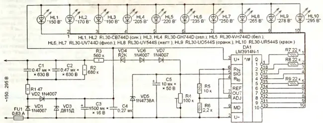 В индикаторе сетевого напряжения удобно применить линейку из обычных светодиодов, расположенных на прямой линии или на дуге окружности, имитируя шкалу стрелочного измерительного прибора. Считывание показаний такого индикатора почти так же удобно, как стрелочного. Применение светодиодов разного цвета свечения привлекает внимание при возникновении нештатных ситуаций. За показаниями такого индикатора можно следить при плохом освещении и со значительного расстояния.