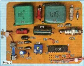 Индикатор был смонтирован на плате из листового изоляционного материала 90x70 мм Ее фотоснимок показан на рис. 2. Детали размещены таким образом, что все соединения удалось выполнить с помощью их выводов и нескольких перемычек из монтажного провода Навесной монтаж снижает вероятность пробоя по поверхности печатной платы между тонкими краями проводников, имеющих большую разность потенциалов В промышленных приборах эту проблему решают не только увеличением зазоров между проводниками, но и специально расположенными на пути возможных поверхностных пробоев воздушными промежутками в диэлектрике платы