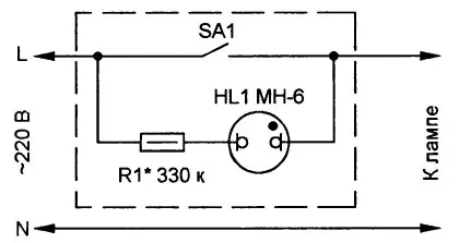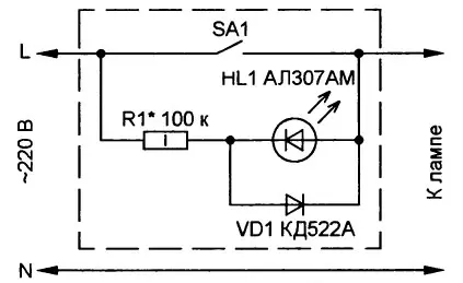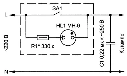 Во многих жилых и производственных помещениях установлены выключатели со светящимися индикаторами. Такой индикатор, подключённый параллельно контактам выключателя, облегчает его поиск в темноте Он содержит токоограничительный резистор R1 и неоновую лампу HL1 (рис. 1) или свето-диод HL1, защищённый от обратного напряжения диодом VD1 (рис. 2). Совместно с лампами накаливания такой индикатор работает замечательно - при разомкнутых контактах выключателя SA1 ток, ограниченный резистором R1 до уровня долей-единиц миллиампер, протекает через индикатор, вызывая его свечение, и через лампу, не оказывая на неё никакого воздействия.