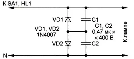 Конденсатор С1 удобнее всего установить в месте подключения светильника к электропроводке квартиры. Наиболее надёжны конденсаторы от сетевого фильтра импортной аппаратуры, которые специально предназначены для включения в цепь переменного тока, о чём свидетельствует маркировка "АС". Именно такому конденсатору соответствует номинальное переменное напряжение 250 В, показанное на рис. 3. Несколько хуже отечественные К73-17 с номинальным напряжением 630 В и БМТ-2.
