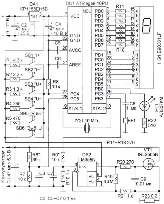 Схема прибора показана на рис. 1. Его основа - микроконтроллер АТмедав (DD1). Клавиатура с однопроводным интерфейсом состоит из шести кнопок SB1-SB6. Информация об измеренных параметрах аккумулятора выводится на девятиразрядный светодиодный индикатор HG1. Для разрядки подключаемого аккумулятора использован источник тока, управляемый напряжением (ИТУН) на ОУ DA2, транзисторе VT1, резисторах R9, R10, R19-R21, R23 и конденсаторах С7, С9.