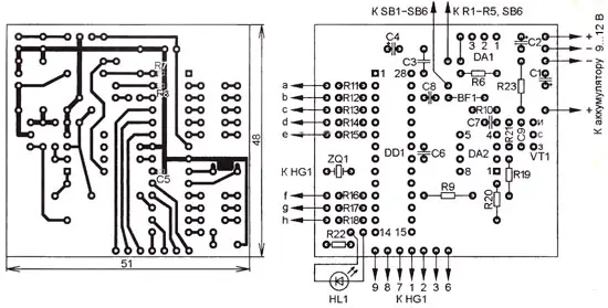 Большая часть деталей смонтирована на печатной плате из односторонне фольгированного стеклотекстолита, чертёж которой показан на рис. 5 Тонкими прямоугольниками показаны компоненты поверхностного монтажа R7, R8 и С5, установленные со стороны печатных проводников.