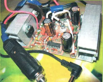 Внешний вид собранной платы устройства показан на рис. 2. Микросхему КР1114ЕУ4 (DA1) можно заменить аналогами МВ3759Р, TL494CN, КА7500В, IR9494. Вместо транзисторов КТ8102Б (VT1, VT3) и КТ8101Б (VT2, VT4) можно применить КТ8102А и КТ8101А соответственно. Транзисторы VT1 и VT2 следует установить на одном теплоотводе, П"3 и VT4 - на другом. Площадь каждого теплоотвода - около 200 см2. На транзисторе комплементарной пары с меньшим коэффициентом передачи тока базы больше падение напряжения и рассеивание тепла, поэтому установка транзисторов в каждом плече моста на общий теплоотвод позволяет выровнять их тепловой режим. При этом не требуется электрическая изоляция транзисторов от теплоотвода.