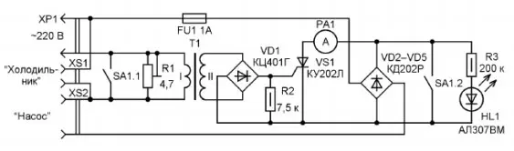 Последовательно с тринистором в цепь питания насоса включён амперметр постоянного тока PA1 с пределом измерения 0,6 А. Поскольку используемый насос имеет трёхпозиционный переключатель мощности, то в зависимости от его положения амперметр показывает ток 0,1; 0,15 или 0,2 А, что позволяет судить о фактической мощности насоса в данный момент и при необходимости оптимизировать её применительно к температуре воды в водонагревателе.