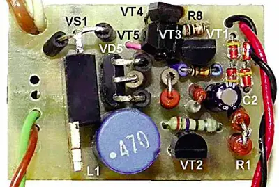 Вместо высоковольтного транзистора BF420 можно применить BF393, MJE340, KF13001, MJE13001, MPSA-42,2N6517, а вместо BF421 - BF493, MJE350, 2N6520. Транзисторы 2SC3199 заменимы любыми из 2SC2787, 2SC3488, 2SD1020, а также серий КТ315, КТ358, а транзистор 2SA1048 - любым из 2SA1150, 2SA1378 и серий КТ361, КТ209. Возможная замена симистора BT138-800 - MAC320A8FP MAC320A6FP MAC320A10FP, MAC228-6FP, MAC228A6FP, MAC228-8FP, MAC228A8FP, MAC212A8FP, MAC212A10FP. Симистор работает без теплоотвода. Дроссель L1 - малогабаритный промышленного изготовления с обмоткой сопротивлением не более 0,1 Ом.