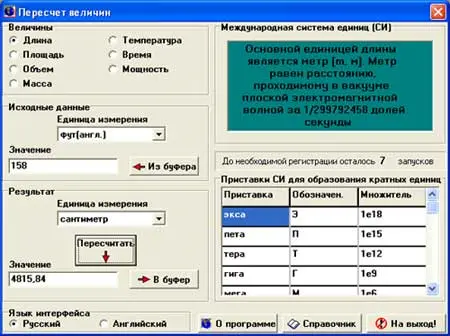 Программа UNITS предназначена для пересчета численных значений величин из одних единиц измерения в другие. UNITS так же может использоваться в качестве мини-справочника по международной системе единиц СИ.