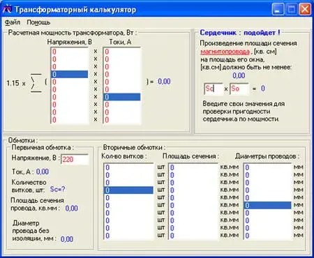 Программа для упрощенного расчета сетевых трансформаторов врадиолюбительской практике. Расчет ведется при условиях: частота - 50 Гц, форма тока - sin, магнитная индукция сердечника - 1,5 Тл, средняя плотность тока в обмотках - 2,5 А/кв. мм, максимальная температура обмоток - 50 град