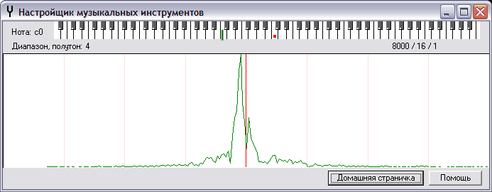 Принцип действия: Программа записывает звук с инструмента и по этому звуку рисует спектр. Вращением колков нужно совместить спектр с красной меткой.