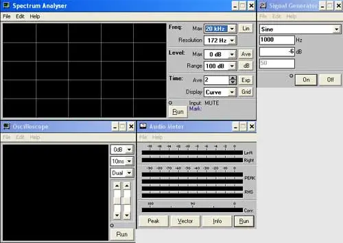 Пакет программ, содержащий в себе четыре программы-анализатора, работающие через звуковую карту. Oscilloscope - программа-симулятор двухканального осциллогафа. Analyser - программа-симулятор спектроанализатора. Audio Meter - программа позволяющая измерять входные уровни напряжения на звуковой карте. Signal Generator - программа генерирует сигналы различной формы в диапазоне частот 20Гц...20кГц, а также позволяет формировать белый шум.