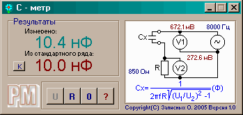 Измеритель емкости оценивает электрическую емкость в пределах от нескольких пикофарад до1 микрофарады. Показывает измеренное значение емкости, ближайшее значение из стандартного ряда для конденсаторов. Автоматически выбирает поддиапазон, переключая частоту генератора.