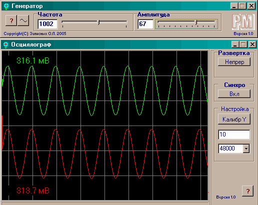 Выходное напряжение генератора определятся регулятором Амплитуда, а также положением звуковых регуляторов громкости и баланса Windows, максимальная амплитуда сигналов без искажений - около 1 В.