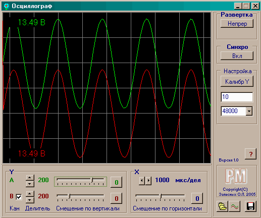 Диапазон измеряемых осциллографом напряжений определятся резистивнымиделителями, смонтированными на кабеле (см. схему в помощи программы - "?"). При R1 =0 всенапряжение поступает на вход АЦП звуковой карты, следовательноможно без искажений рассматривать сигналы амплитудой не более 500..600мВ. При использовании резисторов указанных на схеме номиналовполучается диапазон напряжений до 25 В, что обычно достаточно в любительской практике.