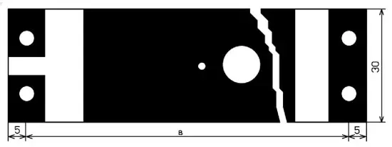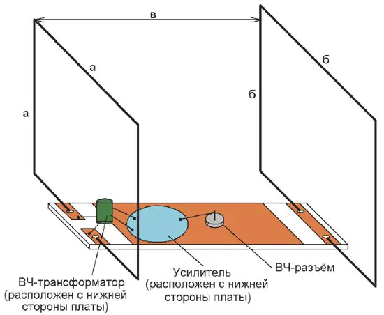 Все элементы устройства размещены на печатной плате из двухстороннего фольгированного стеклотекстолита толщиной 1,5...2 мм, её чертёж показан на рис. 2. Усилитель и ВЧ-трансформа-тор установлены на нижней стороне платы. Металлизация на второй стороне повторяет металлизацию на первой. Ширина платы - 30 мм, а длина зависит от расстояния в между рамками. Для крепления рамок предназначены отверстия диаметром 4 мм. Слева - отверстия для крепления директора, справа - отверстия для крепления рефлектора. Большое отверстие - для крепления разъёма типа F, к которому припаян выход усилителя. К концам рамки директора припаивают вход ВЧ-трансформатора, а его выход - ко входу усилителя. Небольшое отверстие рядом с большим предназначено для провода, соединяющего выход усилителя с разъёмом. Трансформатор намотан вдвое сложенным проводом ПЭВ-2 0,25 на оправке диаметром 5 мм и содержит 3 витка. Витки скреплены клеем "Момент".