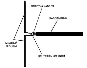 Зачищаем c одного конца белый телевизионный кабель RG6U. Получаем центральный проводник и оплетку кабеля. К центральному проводнику припаиваем медный провод любой толщины длиной около 8,2 см (для диапазона 900 МГц) и крепим его вертикально вверх. К оплетке припаиваем второй кусок провода такой же длины и крепим его вертикально вниз (рис. 1). Получаем нечто похожее на букву "Т", положенную набок. (В телевидении используется горизонтальная поляризация, а в GSM - вертикальная, поэтому требуется именно такой диполь.) Другой конец кабеля подключаем через переходник к телефону. Будьте внимательны и не замкните центральную жилу с оплеткой, иначе телефон может сгореть. Ну вот, за 5 минут мы соорудили примитивную антенну, не уступающую по параметрам китайским автомобильным.