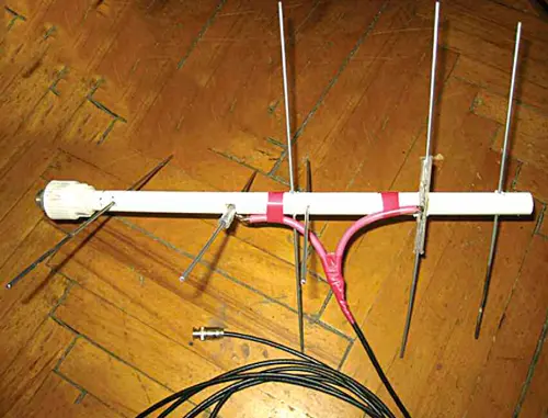 Антенна собирается на базе неарми-рованной ПВХ водопроводной трубы подходящего диаметра длиной примерно 0,5 м. В качестве элементов антенны можно использовать жёсткую проволоку из меди, латуни или алюминия диаметром 1,5...2 мм.