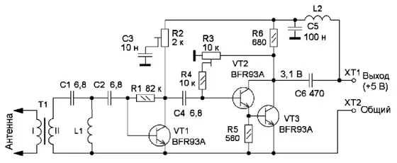 Усилитель предназначен для усиления сигналов телевизионного ДМВ-диапазона и является доработанным вариантом усилителя, описание которого приведено в [1]. Он собран на однотипных транзисторах BFR93A [2], что упрощает его изготовление. Схема усилителя показана на рис. 1. Питается он по кабелю снижения от встроенного в телевизор источника питания напряжением 5 В. Трансформатор Т1, установленный на входе усилителя, обеспечивает гальваническую развязку с элементами антенны и защищает входной каскад на транзисторе VT1 от статического электричества. Далее следует ФВЧ C1L1C2, который подавляет сигналы с частотами менее 400 МГц. Резистором R2 можно регулировать усиление, а резистором R3 устанавливают режим выходного каскада на транзисторах VT2, VT3 по постоянному току, указанный на схеме.