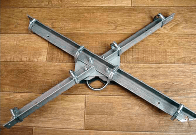 Каждая распорка (удилище) крепится к крестовине с помощью двух червячных хомутов. В местах установки хомутов распорка предварительно обмотана резиновой лентой, вырезанной, например, из негодной велокамеры. А резиновая лента, в свою очередь, закреплена посредством нескольких витков ПХВ-изоленты.