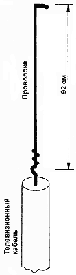 Начнем с антенны (рис.1). Это просто отрезок алюминиевой проволоки диаметром 3...4 мм и длиной 92...93 см (как раз половина длины волны). Верхний кончик (1 см) проволоки загнут примерно под 90°, как крючок, чтобы ее было проще подвесить. К нижнему концу, после зачистки, крепится центральная жила обычного коаксиального телевизионного кабеля (75 Ом). Его оплетка ни к чему не подключается.
