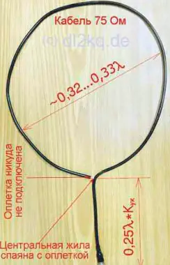 От разделанного верхнего конца отступают ровно на одну длину волны, и в этом месте аккуратно вскрывают внешнюю изоляцию кабеля, не повреждая оплётку, так, чтобы её фрагмент был доступен для пайки. В этом месте к оплётке припаивают центральный проводник верхнего конца, и это соединение гидроизолируют (например, термоклеем). Получившейся петле придают форму круга или квадрата.