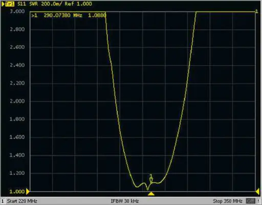 По вышеописанному рецепту была изготовлена измерительная антенна на частоту 290 МГц (λ=1,03 м) из отрезка коаксиального кабеля RG-59 длиной 1,2 м (1,165λ). Зависимость КСВ этой антенны от частоты показана на рис. 2.