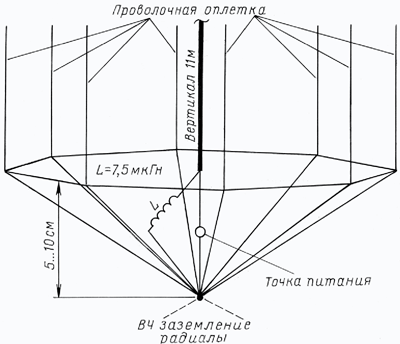 Система противовесов ("радиалов") обычна для многодиапазонного "вертикала". Если антенна установлена непосредственно на земле, то укладываются несколько (чем больше, тем лучше, но минимум четыре) нерезонансных "радиалов" длиной несколько метров (для работы от 3,5 МГц минимум 10 м) прямо на грунт (или неглубоко прикопанных).