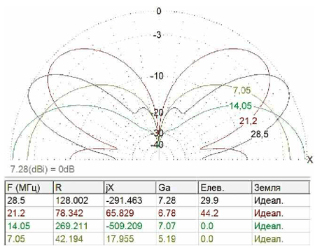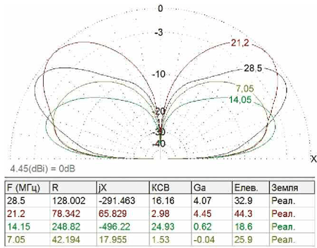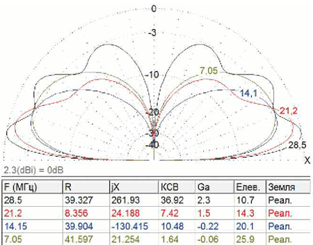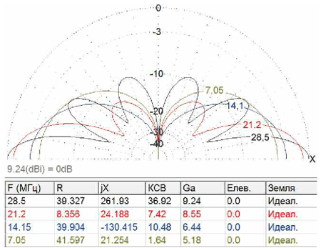 2. Диаграмма направленности (ДН), обеспечивающая максимум излучения под низкими зенитными углами во всех диапазонах. Для работы с DX бесполезна мощность, ушедшая выше 20о. Излучилась ли она под более высокими углами или вообще не излучилась в эфир - результат в приёмнике DX будет один: вас не услышат.