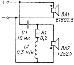 Катушку индуктивности L1 наматывают эмалированным проводом диаметром 0,5...0,8 мм на пластиковую трубу диаметром 25 мм, ширинанамотки - 20 мм. 120 витков провода длиной 10,2 м создают индуктивность 0,3 мГн. Конденсатор С1 - К73-17 или К78-2 (лучше). Резистор R1 сопротивлением 0,2 Ом изготавливают из высокоомной проволоки: берут кусок длиной несколько метров, измеряют его сопротивление и откусывают соответствующую нужному сопротивлению часть. Диаметр проволоки должен быть не менее 0,2 мм. Фазу (полярность) включения головок определяют опытным путём. Здесь на схеме показана полярность, оптимизированная при измерении на "розовом" шуме.