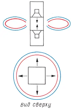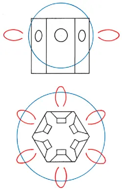 Принцип работы третьего типа АСПП легко понять из конструкции, условно изображённой на рис. 4. Исключение половины комплекта громкоговорителей контрапертурной АС позволяет избежать свойственных ей недостатков. Здесь также излучаются звуковые волны с круговой диаграммой направленности во всём диапазоне частот.