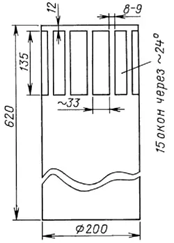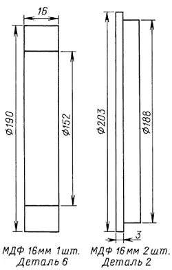 Подобная вертикальная конструкция АС позволяет использовать в качестве корпуса трубу, что выгодно отличает её от стандартных кубических корпусов. В качестве корпуса 11 (рис. 8) выбрана пластиковая труба ПВХ 200x4,9x2000, используемая, в частности, в канализационных системах. Одной трубы длиной 2 м достаточно для двух АС. Кольца 1, 2, 6, 10 изготавливают из МДФ толщиной 16 мм. На рис. 9 приведён чертёж деталей 2, 6. Детали крепят к корпусу потайными саморезами 3x19 мм (3-4 шт.). На деталь 2, установленную в нижней части корпуса, крепится фильтр 9, она имеет отверстие для вывода сигнального провода. Деталь 6, на которой установлены динамические головки, крепится в корпусе 11 с условием, что верхняя плоскость кольца установлена заподлицо с нижним краем окон корпуса 11. Для прокладки провода, идущего к ВЧ-головке 4, в одно из крепёжных отверстий НЧ-головки 5 не устанавливают саморез, а пропускают провод на ВЧ-головку, которую закрепляют любым способом (на бонках, на конструкции, спаянной из медной проволоки диаметром 1...1,5 мм) и фиксируют саморезами, которые крепят НЧ-головку. Основное требование - это обеспечение необходимого зазора между диффузором ВЧ-головки и рассеивающим конусом 3. Конус, показанный на рис. 10, можно изготовить из МДФ или толстого пластика. Для придания жёсткости пластиковый конус можно запенить.